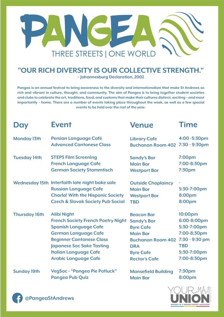 – As part of the Equal Ops Committee, helped organise events in collaboration with student societies for Pangea, a festival and project celebrating the cultural diversity within St Andrews.