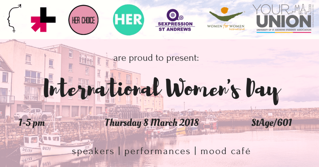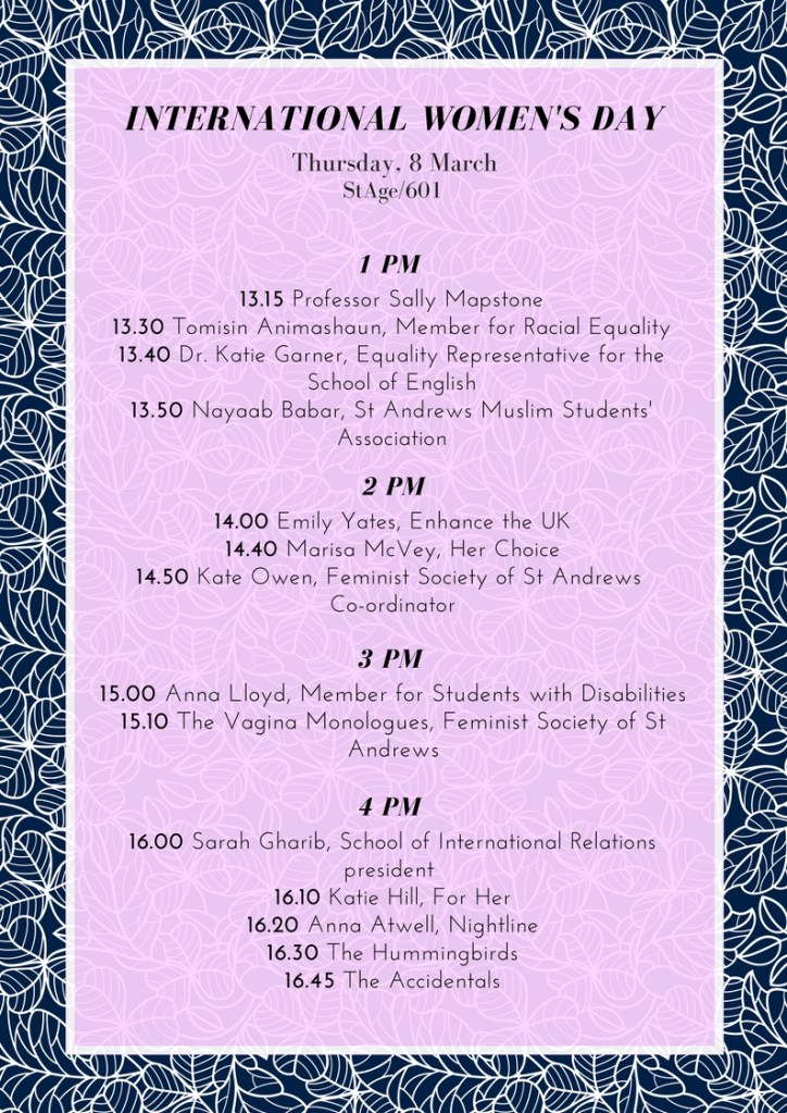 – Worked in collaboration with the following societies: Women for Women International, Feminist Society of St Andrews, For Her, Her Choice, Sexpression, and HeforSheSt Andrews, on an International Women’s Day drop-in speaker, performance, and mood cafe event. The cover photo, event page designs, and program I made for the event are attached below. Arranged for our current principal, Professor Sally Mapstone, Emily Yates, from Enhance the UK, and Dr. Katie Garner, the Equality Representative for the School of English to speak at the event, along with students from various societies, committees, and groups to perform and speak at the event on topics they are passionate about!