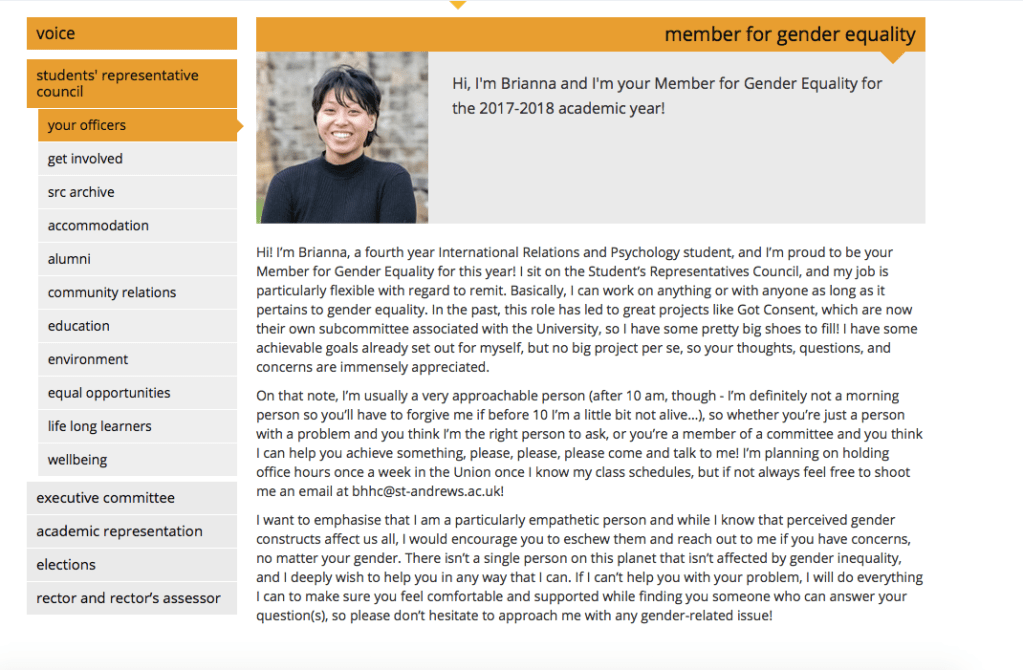– Created a Sexual Health and Safety Guide collating the university’s sexual misconduct policy with other information from sources like the Fife Rape and Sexual Assault Centre, which was completed in August 2017, ready for Freshers Week 2017 (see link below).