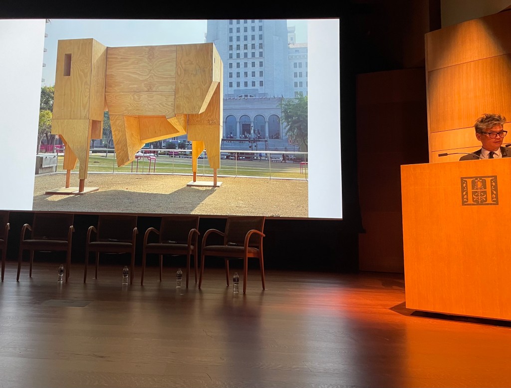 During the “past” panel, each speaker reoriented—every pun intended—the current framing of Asian American history. In examining the history of Chinese-Americans and their role in building the railroads across America, Professor Gordon Chang featured a photo entitled “East and West Shaking Hands.” At first glance, it’s nearly impossible to see any Chinese individuals in the photo at all; the lone Chinese worker, in tattered worker’s garb, was captured with his back facing the camera. Most importantly, he was captured mid-movement, blurry and literally out of focus: the perfect metaphor for the lack of focus on the role of Chinese workers in this grueling feat of transportation they were instrumental in completing. Writer Jean Chen Ho examined the flawed, skewed history of the 1871 LA Chinatown massacre. The most prominently known story of the event submits that a duel between two Chinese men from rival tongs caught a white rancher in their crossfire. This death spurred a predominantly white “vigilance”—or should we say, vigilante—party to consequently murder dozens of mostly uninvolved Chinese people in the process of purportedly attempting to save them, additionally destroying and robbing Chinese businesses in the process. Writer Naomi Hirahara walked us through the Japanese businesses and community members of Pasadena pre-World War Two, and asked us to imagine with her what the town would have looked like had Japanese internment not happened—if the Japanese businesses and communities built there had the chance to continue. And amongst the many pieces Art History Assistant Professor Marci Kwon presented, a personal standout was a piece inspired by the “I am an American” sign that a Japanese grocery in Oakland erected on their storefront following the attack on Pearl Harbor, hoping to forestall the violence to Japanese-Americans that was to come. Contemporary Filipina artist Stephanie Syjuco took that historical image and reframed the statement as a fabric banner, in which she compacts the letters comprising “American,” asking viewers to contemplate what being an “American” means to them.